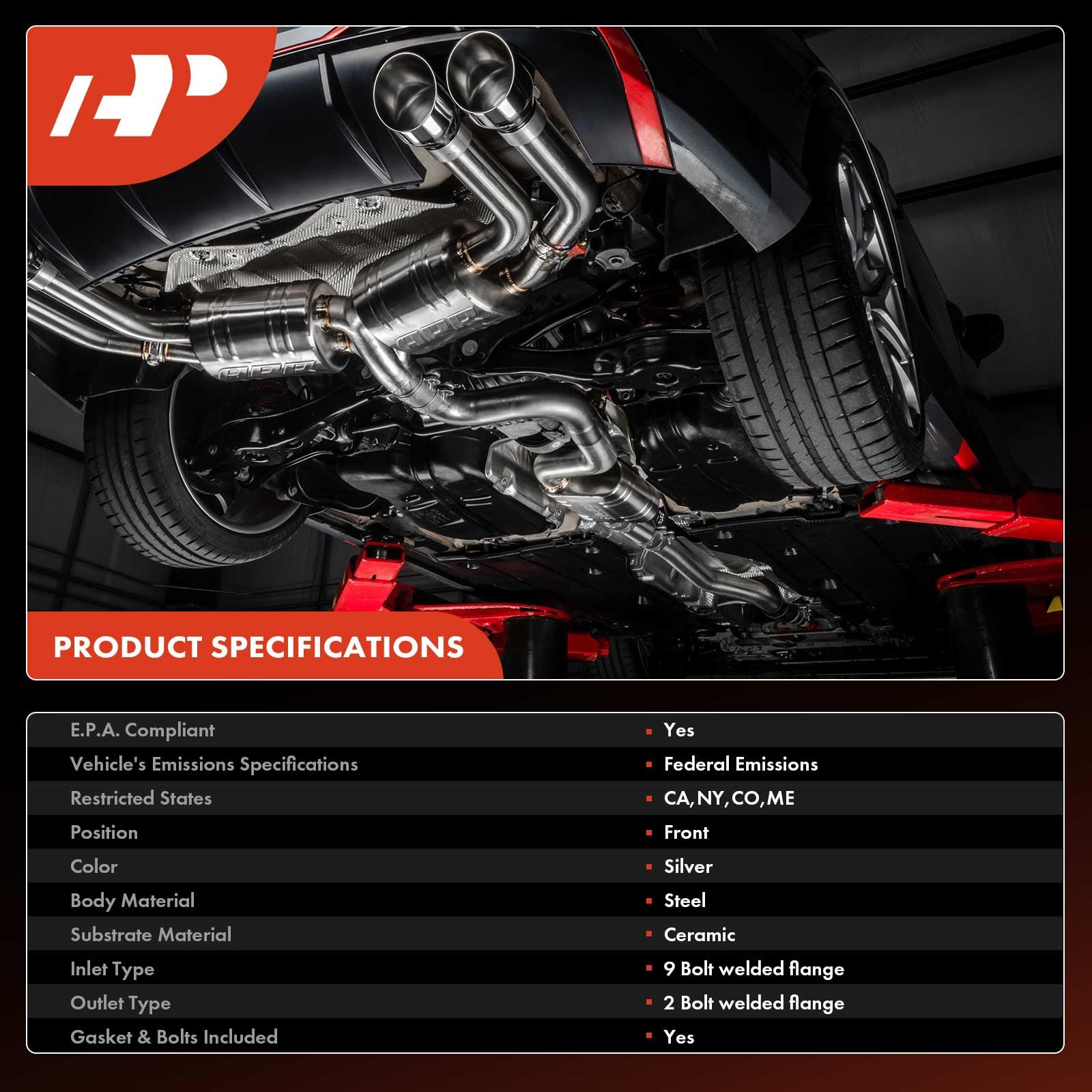 - [Specification]: ① E.P.A. Compliant: Yes; ② Vehicle's Emissions Specifications: Federal Emissions; ③ Restricted States: CA, NY, CO, ME; ④ Body Material: Stainless Steel; ⑤ Inlet Type: 9 Bolt Welded Flange; ⑥ Outlet Type: 2 Bolt Welded Flange; ⑦ Gasket & Bolts Included: Yes