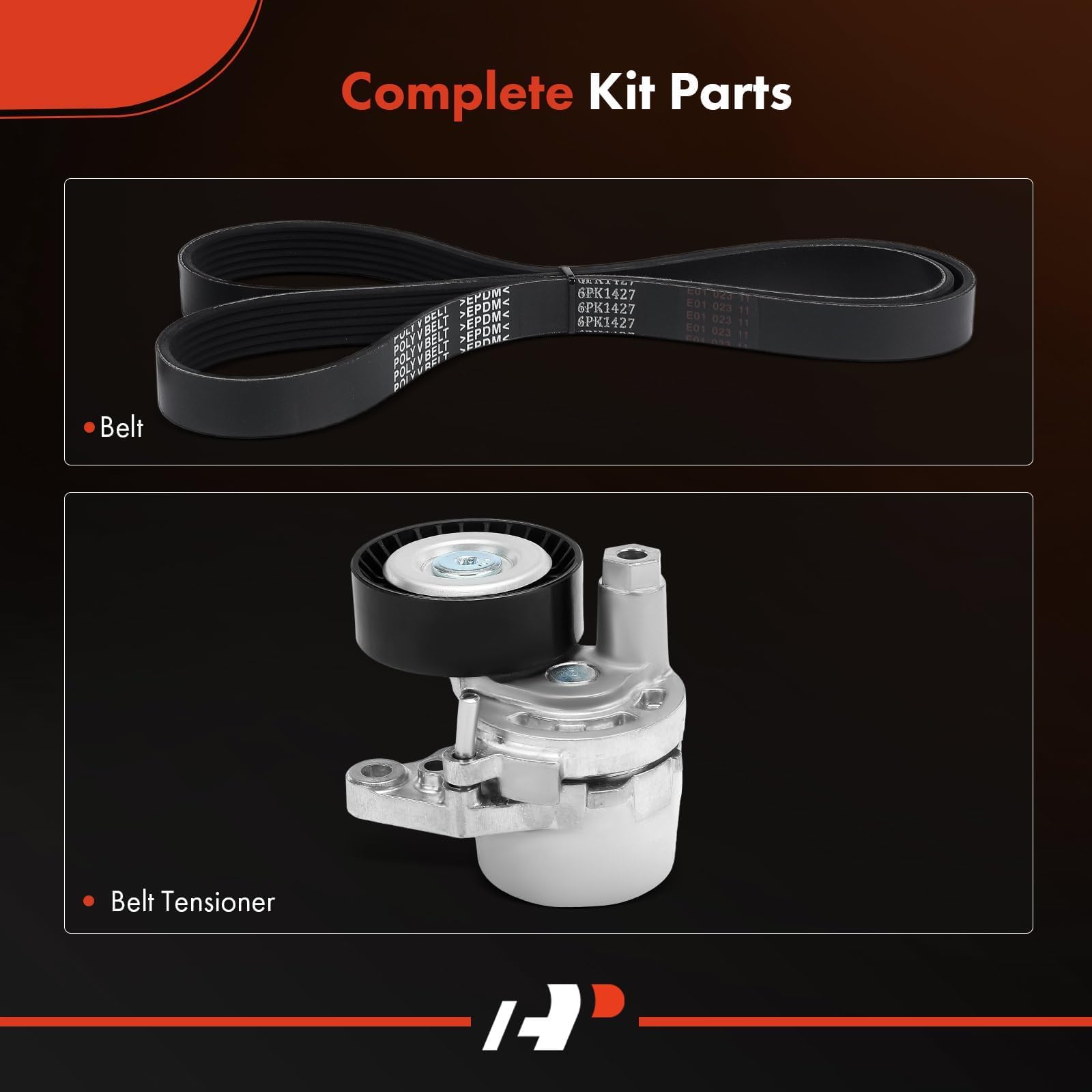 - [Functions]: A-Premium engine serpentine belt drive kit usually locates at the front of the engine and wraps around a set of sprockets. It ensures the connection between the camshaft and crankshaft, making the pistons and valves work together in the correct sequence. It will help the engine run normally, improve fuel efficiency, and thus effectively optimise the engine's performance.