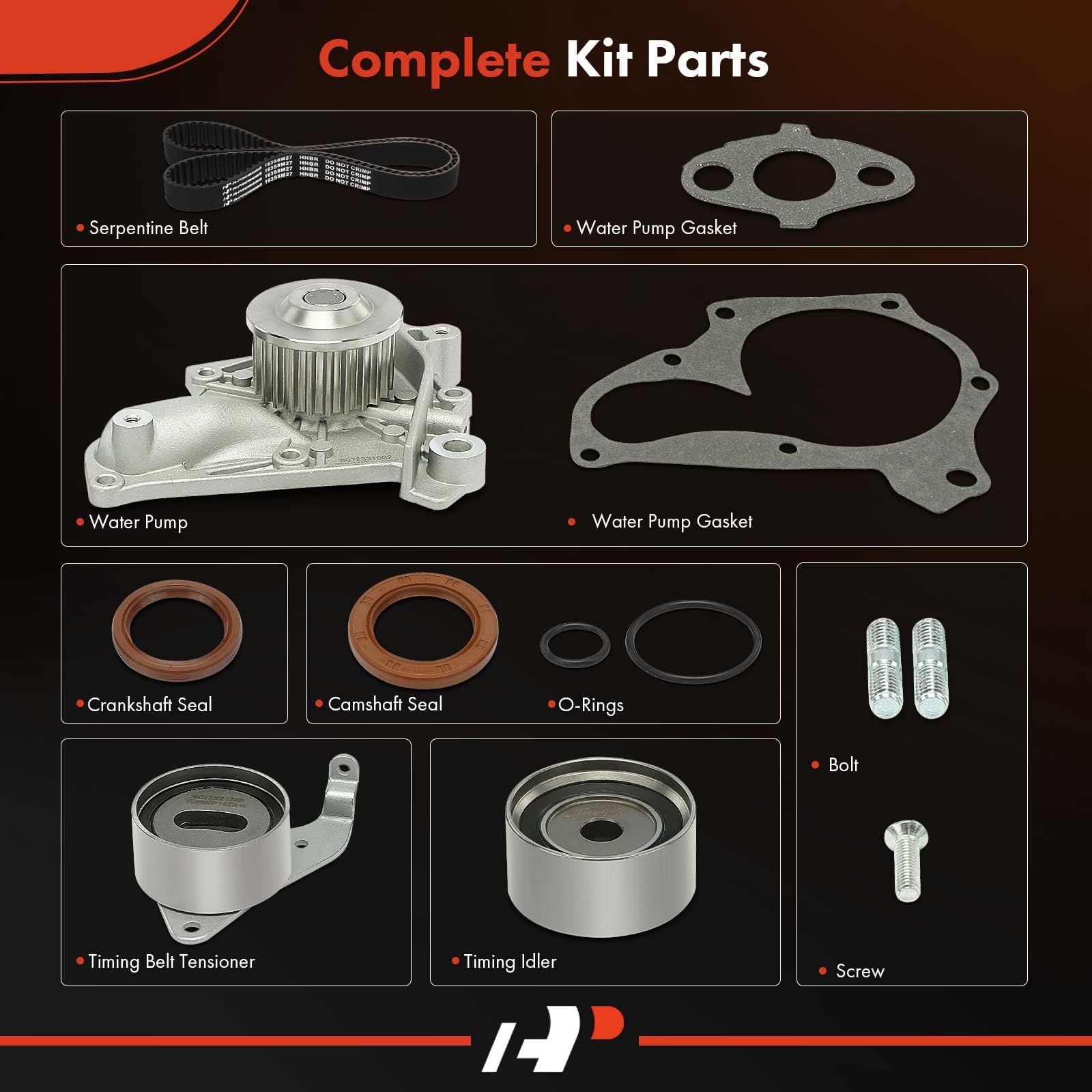 - [Kit Contents]: The A-Premium Camry Timing Belt Kit with Water Pump Includes ① Timing Belt; ② Timing Belt Tensioner; ③2PCS Bolt; ④ Timing Idler; ⑤ Screw; ⑥ Camshaft Seal; ⑦ Crankshaft Seal; ⑧ 2PCS O-Rings; ⑨ Gasket; ⑩ Water Pump with Gasket