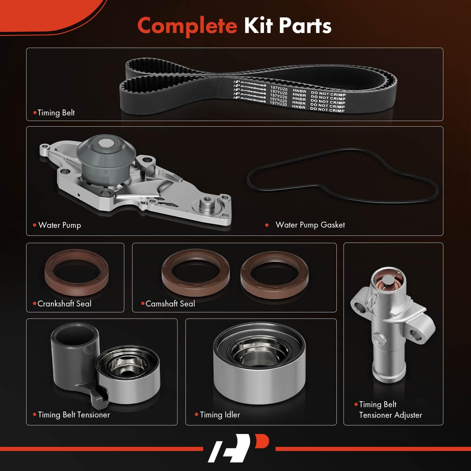 - [Includes The Following OE Parts]: This A-Premium Accord Timing Belt Kit with Water Pump Includes ① Timing Belt; ② Water Pump; ③ Tensioner Pulley; ④ Idler Pulley; ⑤ Hydraulic Tensioner; ⑥ 2x Front Camshaft Seals; ⑦ Front Crankshaft Seal